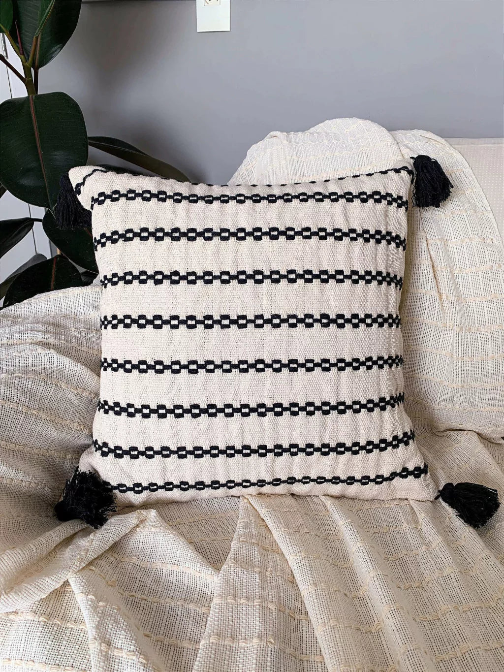 Linda almofada estilo boho minimalista, com desenhos em formato de corrente, muito estilosa e sofisticada para deixar sua casa linda e muito acolhedora!