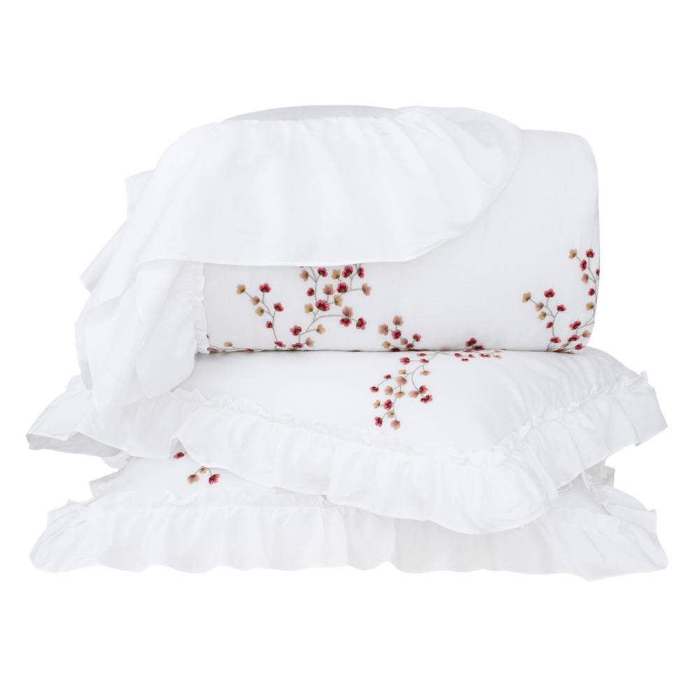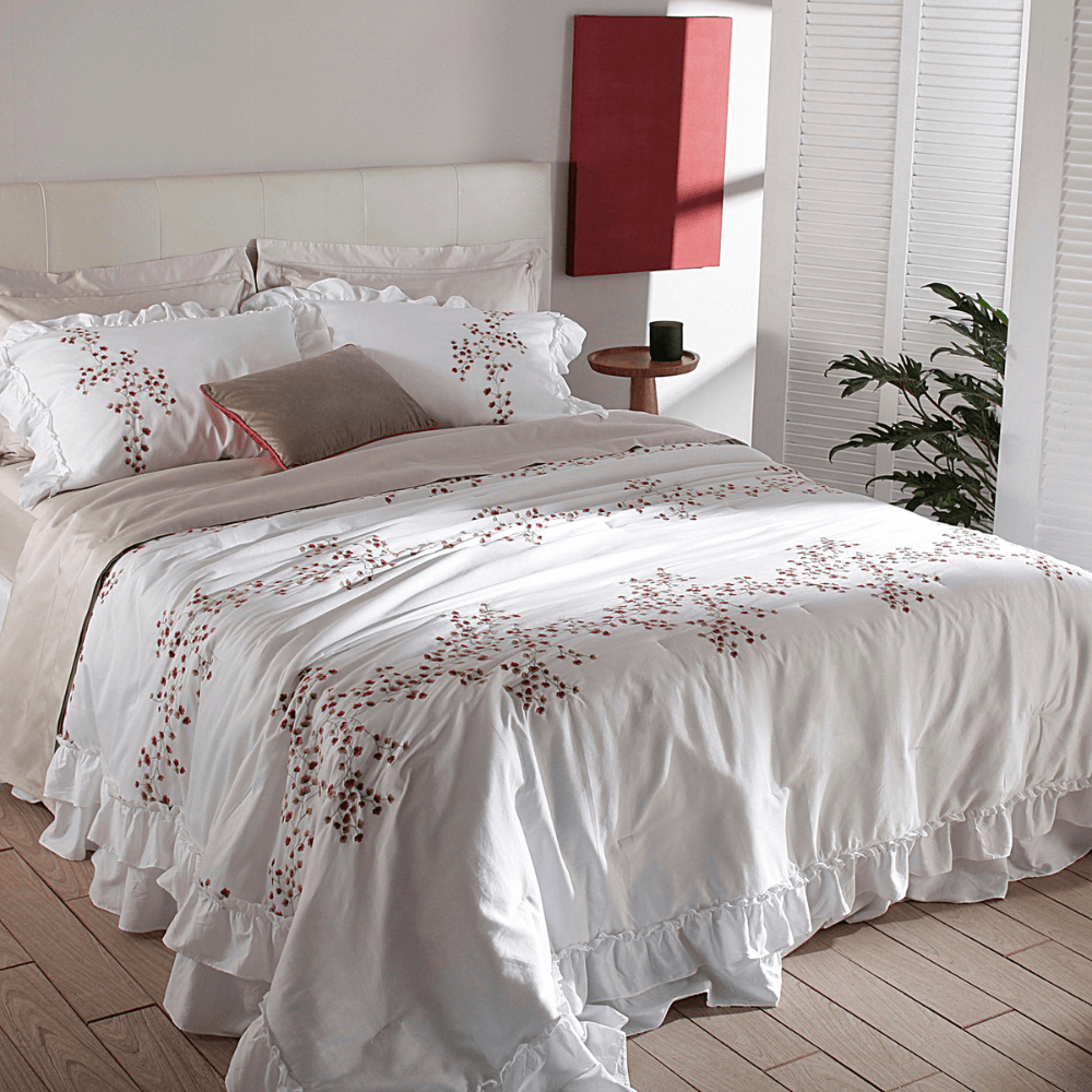 Elegante e delicado, a colcha Arles recebe ricos bordados com flores de cerejeira, que representam renovação e felicidade, conferindo romantismo para a peça. Com base branca que traz luminosidade, o bordado floral em degradê é destacada. Colcha confeccionada em cetim 100% Algodão no verso e seda na parte da frente, os porta-travesseiros dispõem de abas nos três lados com fechamento lateral no estilo envelope. A colcha é volumosa como edredom. Uma peça com extrema maciez resultando em uma noite de descanso ainda mais confortável.